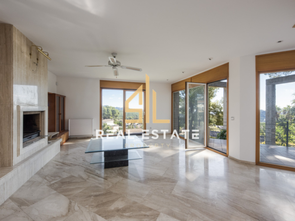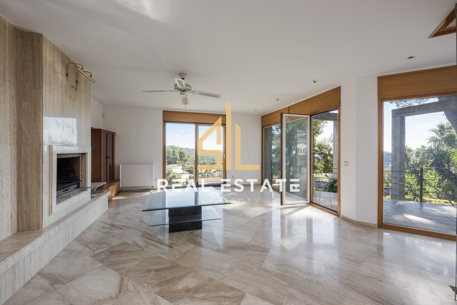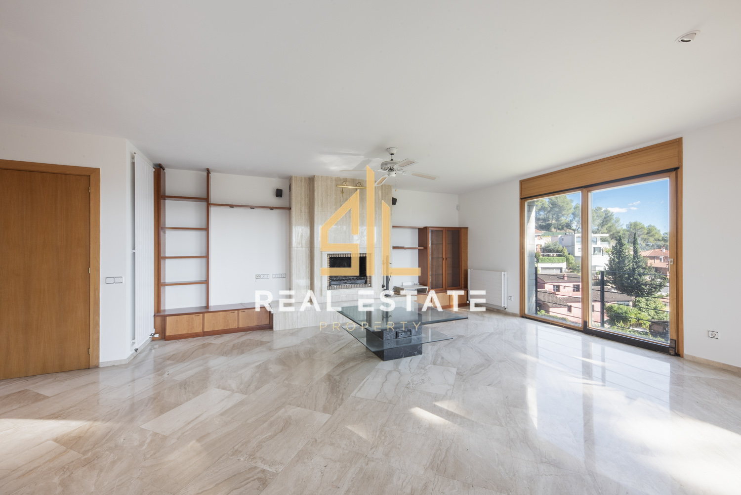 Amplio salón y comedor independientes, con suelos de mármol pulido, chimenea revestida en mármol y grandes ventanales que llenan el espacio de luz natural.