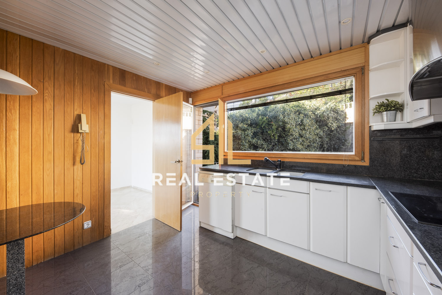 La cocina independiente, equipada con placa de inducción, encimeras de granito, muebles blancos y amplios ventanales, dispone de salida directa al exterior mediante una terraza con escaleras que bajan al jardín posterior.